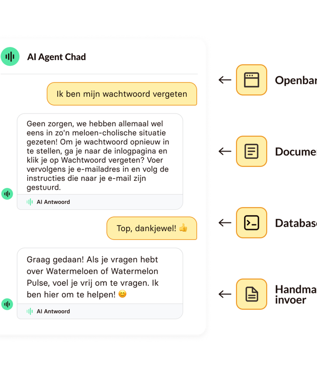 Watermelon is premium AI chatbot sofware. Al vanaf 190 p/m. Wij regelen de volledige implementatie voor je, we zijn Watermelon Partner.