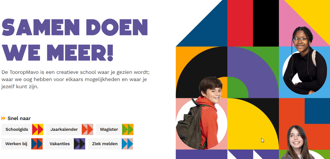 De Toorop Mavo staat al jaren in de top van excellente middelbare scholen. Een school met karakter, hoge ambities en een trouwe achterban. Na jaren op een verouderde site was het eindelijk tijd voor iets nieuws. Maar dan wel iets dat écht bij de Toorop past — geen standaardsite die er uit ziet als alle andere schoolwebsites.